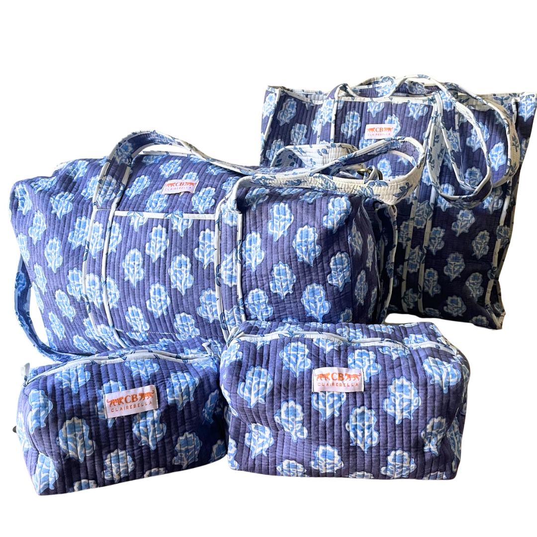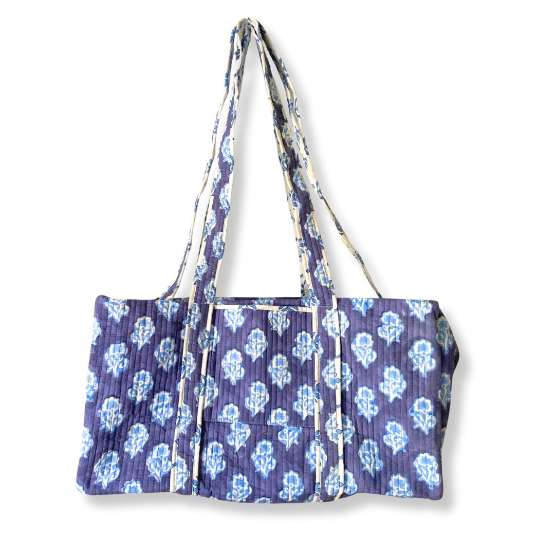 Artistry meets adventure. Hand block printed in India, each piece in this collection is quilted cotton with thoughtful details, coordinating interior prints, and just the right balance of function + style.